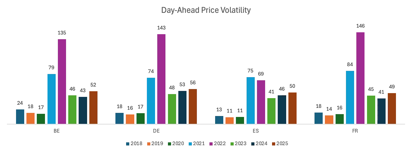 • In all major markets in the EU, the volatilities (measured here as day-ahead electricity) have remained significantly higher than pre-crisis period (see graph)